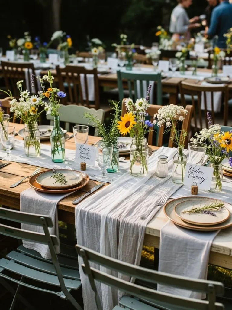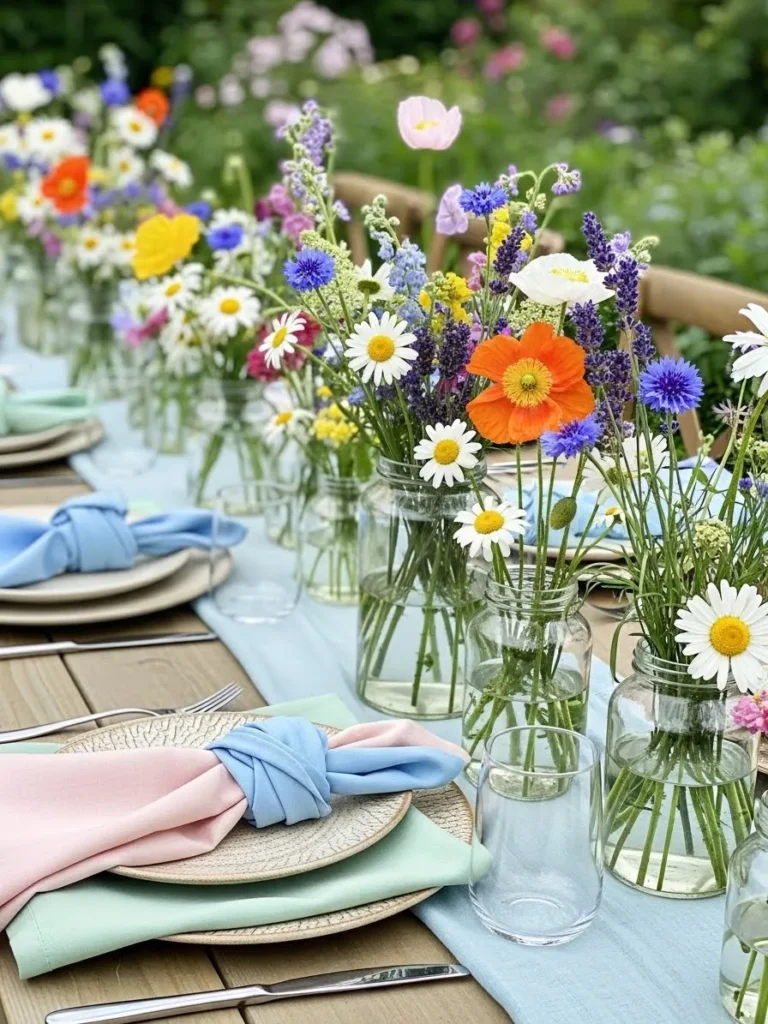 Glass jars filled with colorful wildflowers run down the center of the table, creating a relaxed meadow feel. Soft pastel napkins are casually tied and layered over natural wood chargers. The mix of daisies, cosmos, and small blooms feels effortless and fresh. Everything looks light, airy, and perfect for an outdoor summer celebration.