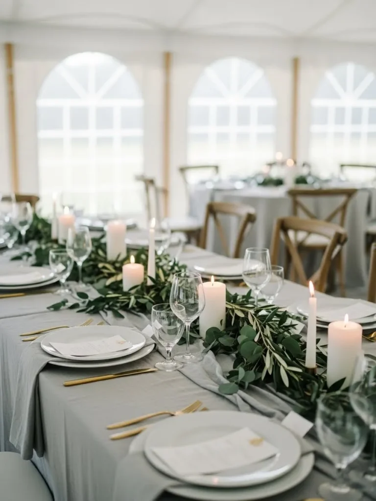 Under a bright white tent, long tables are decorated with greenery garlands, white candles, and neutral linens. Gold flatware adds a subtle hint of polish, while the greenery keeps things fresh and natural. The space feels airy and graceful.