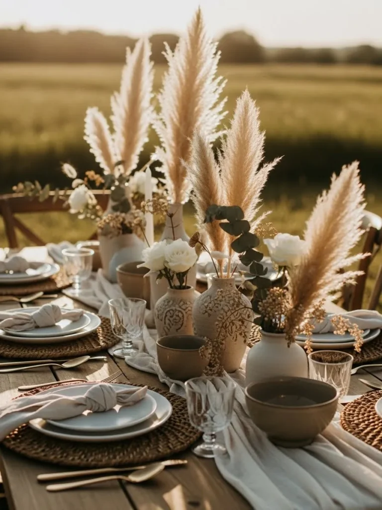Pampas grass arrangements rise from the table alongside textured linens and neutral ceramics. Earthy tones and soft shapes give the table a relaxed boho vibe. Everything feels organic and perfectly suited for an outdoor setting.
