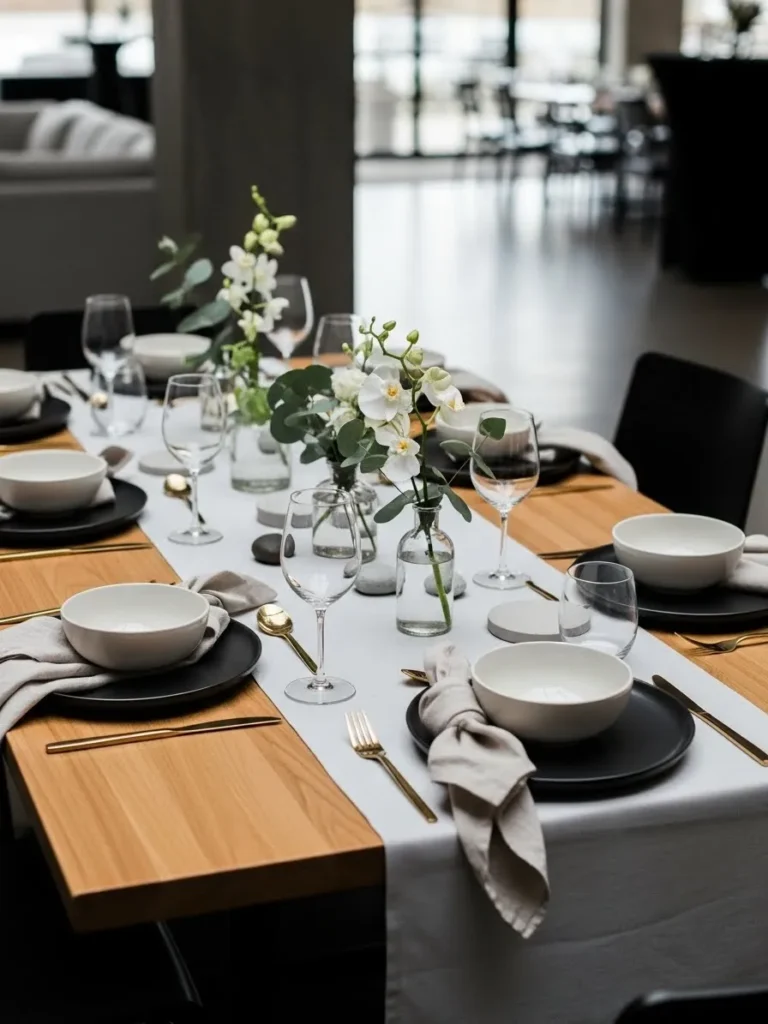 This table features warm wooden surfaces paired with crisp white linens and simple place settings. Neutral napkins are loosely styled, with understated greenery adding a soft organic touch. Clean lines and uncluttered styling give the whole setup a modern and refined look.