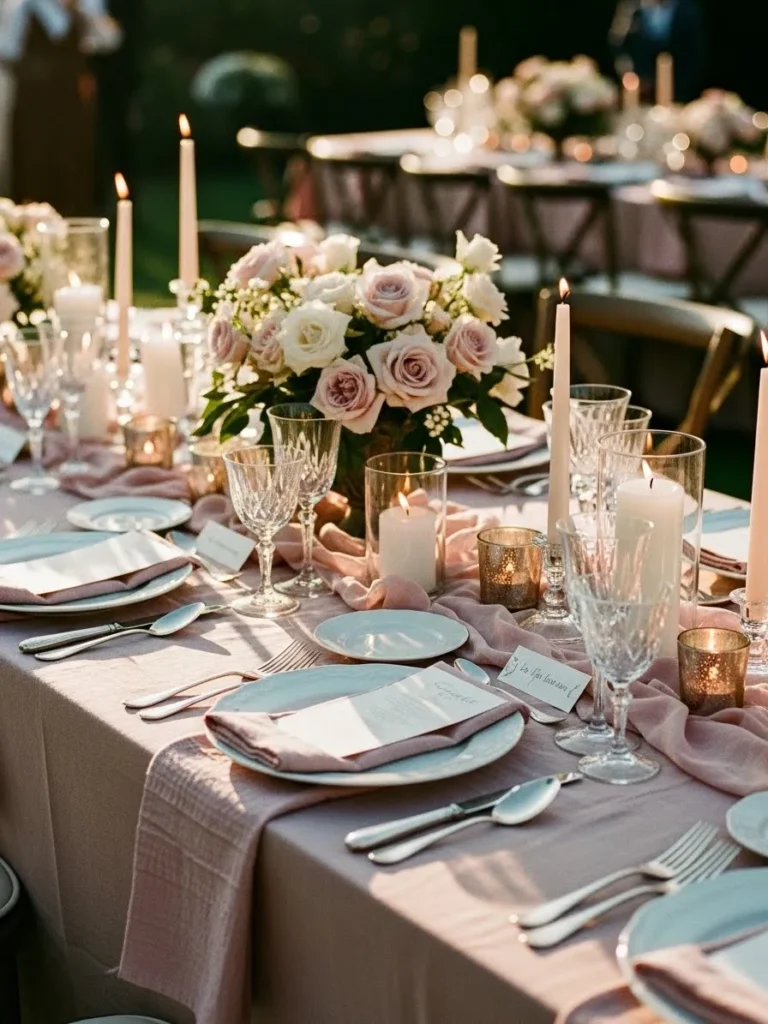 Soft blush linens flow down the table, layered with delicate floral centerpieces and glowing candles. Clear glassware and pale plates keep everything light, while the candlelight adds warmth and softness. The overall mood feels intimate and romantic.