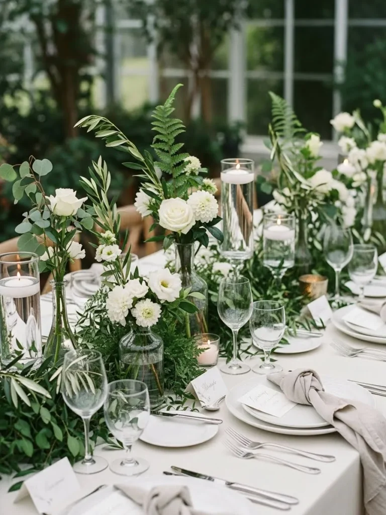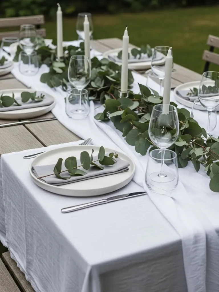 Crisp white linens are topped with simple greenery garlands and tall white candles. Clear glassware and minimal styling keep the look clean and timeless. Everything feels fresh, balanced, and effortlessly elegant.