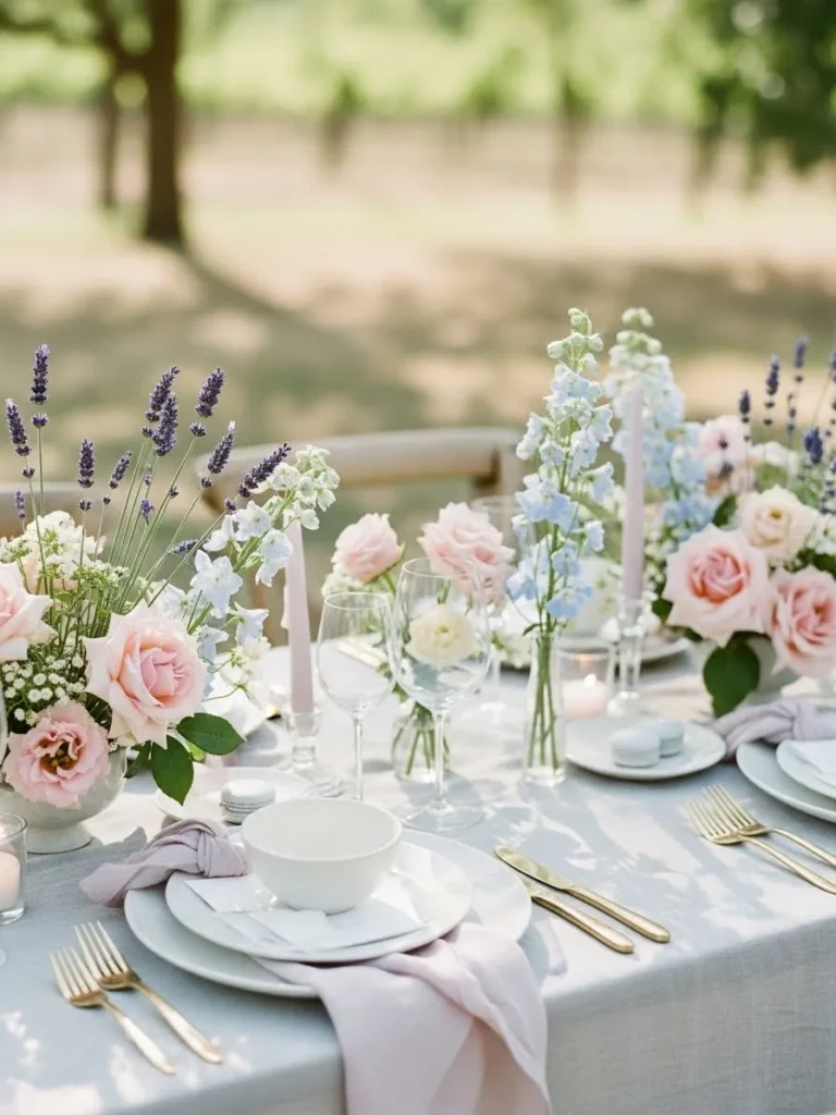 Pastel flowers in pinks, blues, and soft lavender tones are arranged gently across the table. Pale linens and classic white plates keep the look balanced and airy. Everything feels delicate and thoughtfully styled.