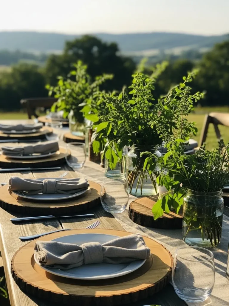 Natural wood tables are paired with simple plates, neutral napkins, and loose greenery arrangements. Glass jars and minimal styling let the countryside setting shine. The look is relaxed and grounded, with an organic summer feel.