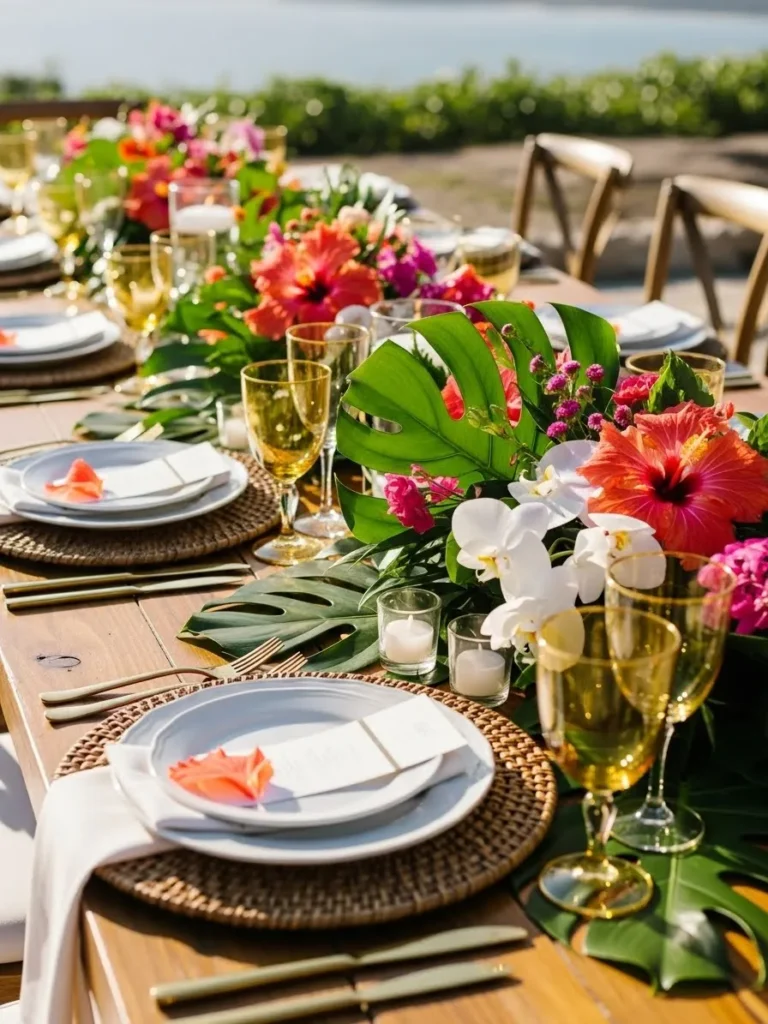 This table is filled with vibrant tropical flowers in shades of coral, pink, and white, layered with glossy greenery and palm leaves. Gold glassware and woven chargers add warmth, while neutral linens keep the colors grounded. The overall look feels rich, lively, and perfect for a summer celebration with a destination vibe.