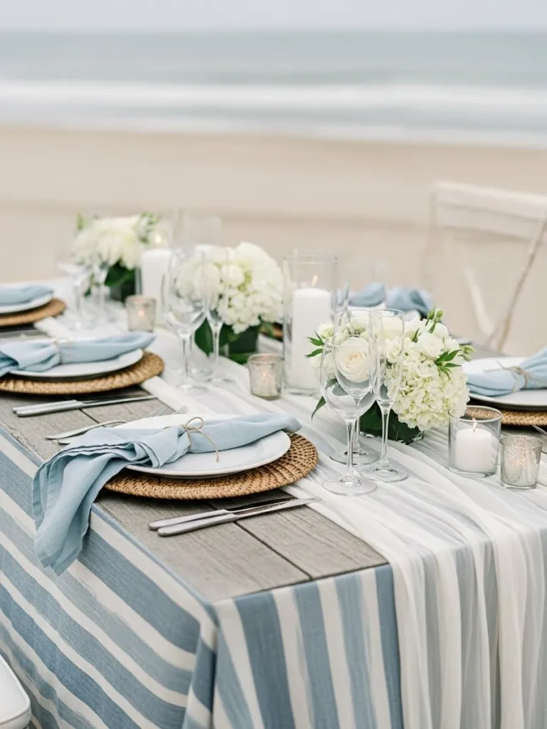 This tablescape features crisp white plates, woven placemats, and a blue striped table runner that instantly feels coastal. Soft blue napkins are loosely draped, paired with low white floral arrangements. The color palette is calm and breezy, with plenty of natural light reflecting off the table.