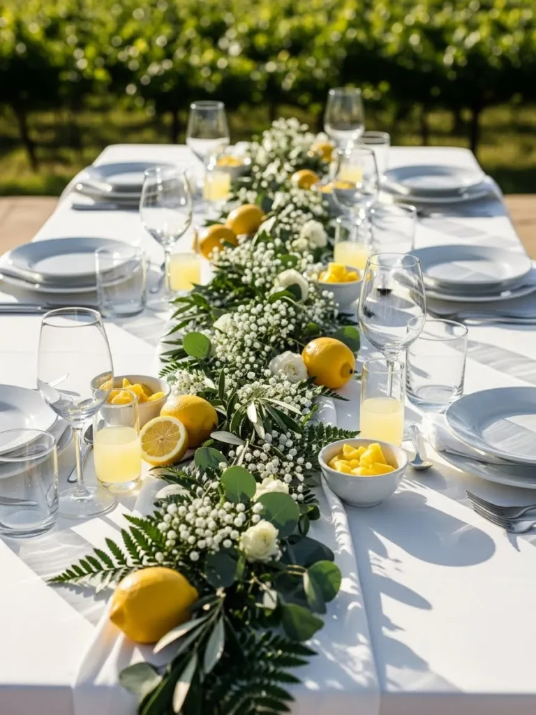 Fresh lemons are woven through lush greenery running down the center of the table. White plates and clear glassware keep the look bright and summery. The pop of yellow adds cheer while still feeling natural and tasteful.