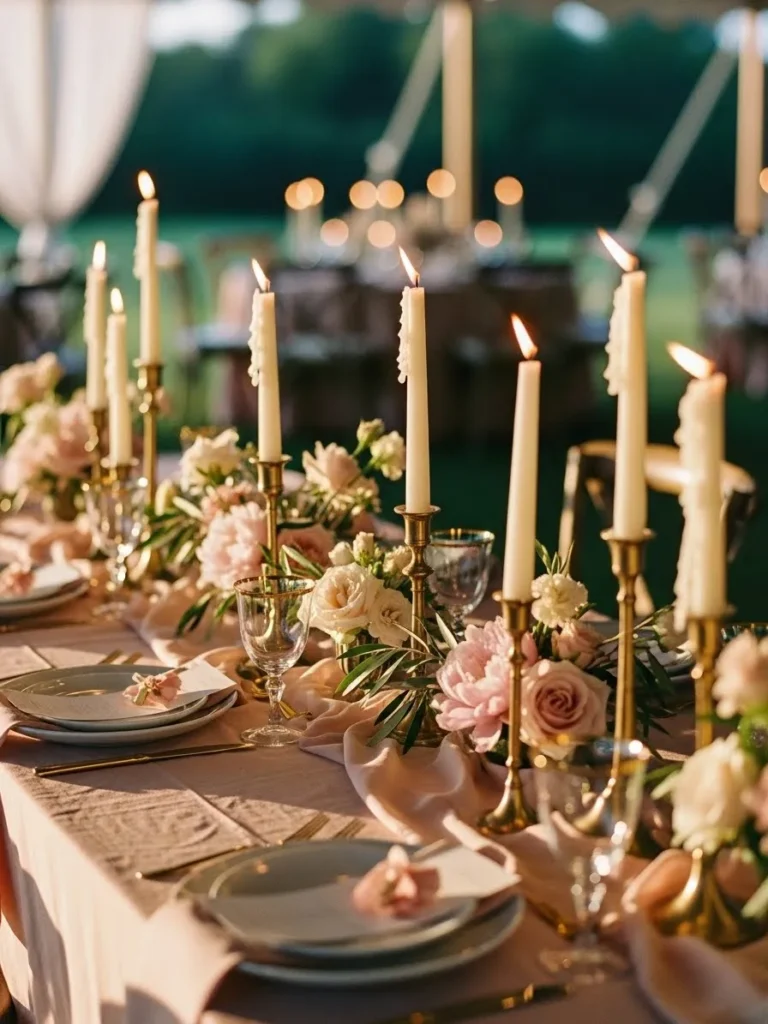 Tall taper candles glow above a table filled with blush flowers, greenery, and soft neutral linens. Gold accents add warmth, while the candlelight creates a cozy evening mood. The florals feel lush without being heavy, and everything flows beautifully together.