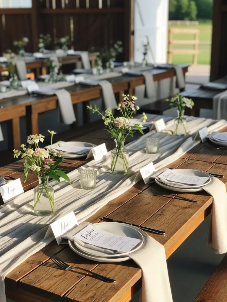 Long wooden tables are paired with simple place settings and minimal greenery running down the center. White plates and neutral runners keep the look grounded and natural. Small floral touches add softness without distracting from the rustic charm.