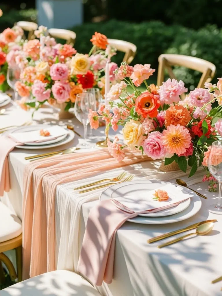 Peach and blush flowers spill across the table, paired with flowing linens in soft warm tones. Gold flatware adds a subtle hint of elegance, while the florals keep everything romantic and summery. The overall look feels gentle and glowing.
