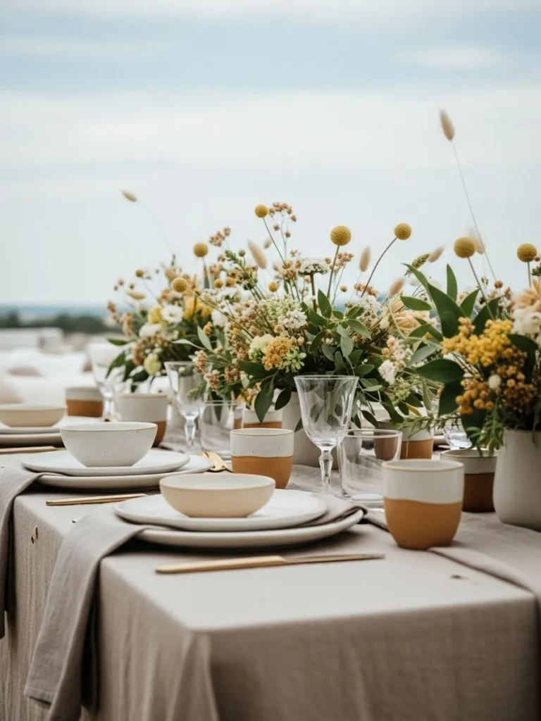 This table features neutral linens, simple ceramics, and loose wildflower arrangements. Everything feels organic and unfussy, with earthy tones that work perfectly for a summer setting. The setup looks calm and balanced, with plenty of breathing room on the table.