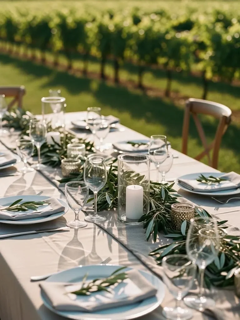 This table is styled with crisp white linens, polished glassware, and simple greenery laid neatly down the center. Wooden chairs and soft natural light give it an elegant vineyard feel. The overall look is clean and refined, with greenery adding just enough softness without overwhelming the table.