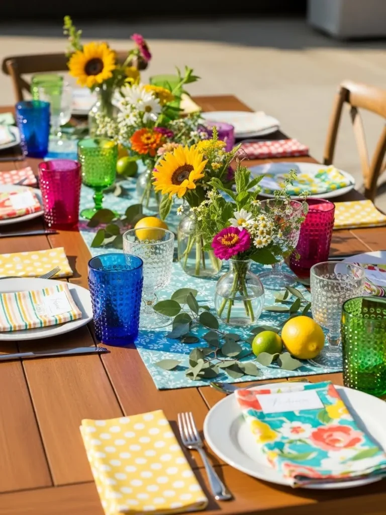 Bright glassware, cheerful florals, and patterned plates bring this table to life. Pops of yellow, pink, and blue feel bold and happy, especially paired with fresh flowers and citrus accents. The setup feels fun, creative, and full of personality.