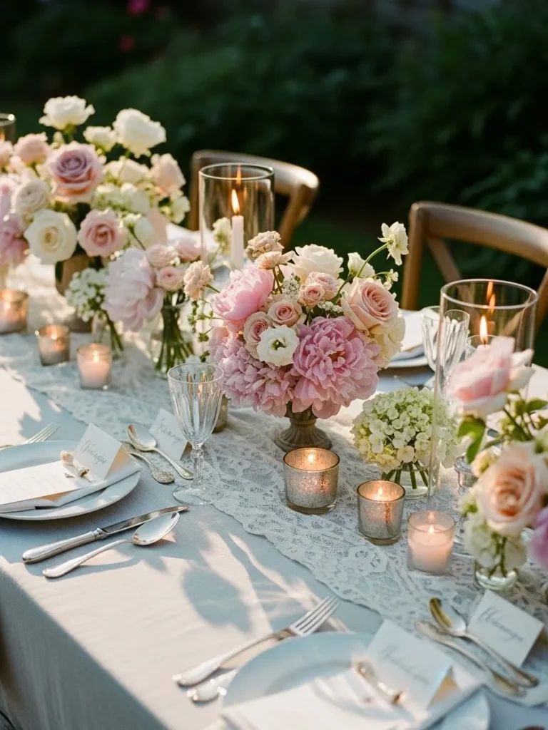 Soft blush flowers are arranged alongside glowing votive candles on a pale linen tablecloth. The florals feel lush and romantic, while the candlelight adds warmth and intimacy. Everything is balanced and classic, with a gentle garden elegance.