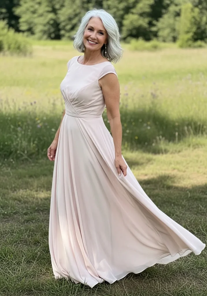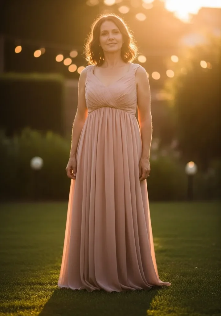 This blush chiffon maxi dress showcases a softly gathered bodice, slender straps, and a fluid skirt that catches the warm glow of sunset lighting. The simple silhouette allows the soft fabric and gentle color to shine, making it ideal for romantic outdoor ceremonies.