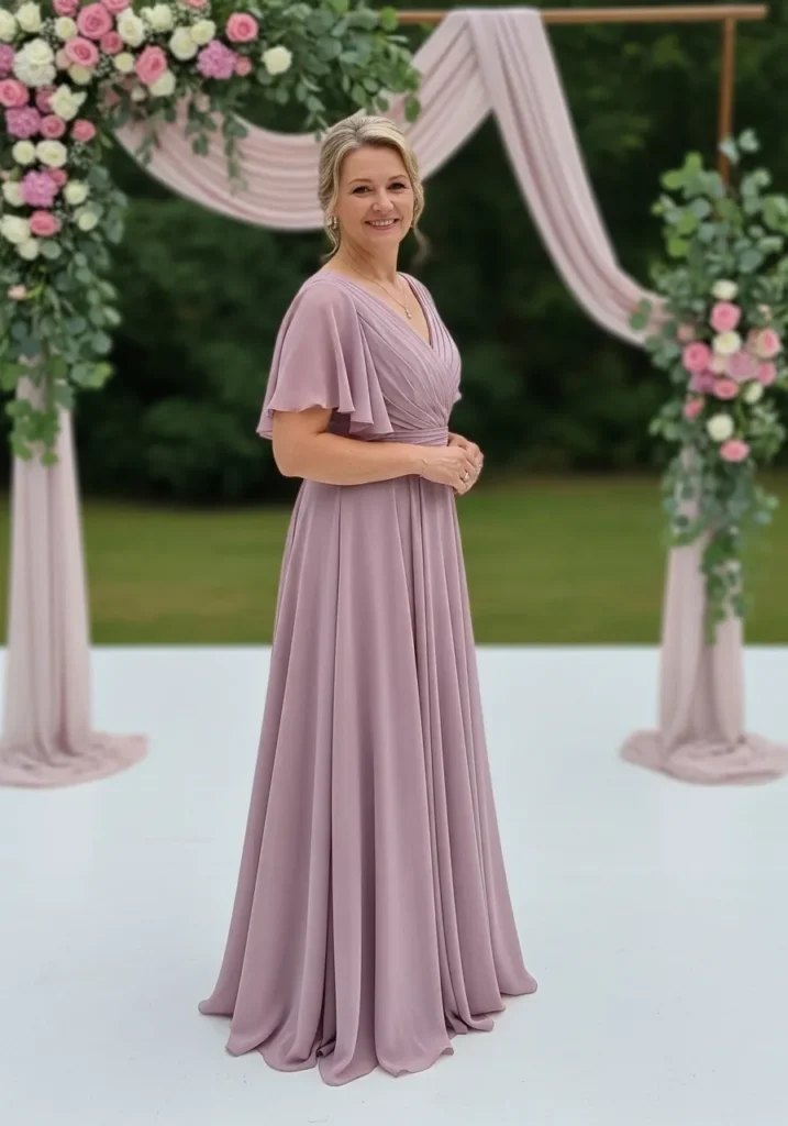 This mauve chiffon gown showcases gentle draping across the bodice, a softly cinched waist, and a flowing skirt that falls beautifully to the floor. The muted lavender tone feels calm and romantic, especially when paired with floral ceremony decor.
