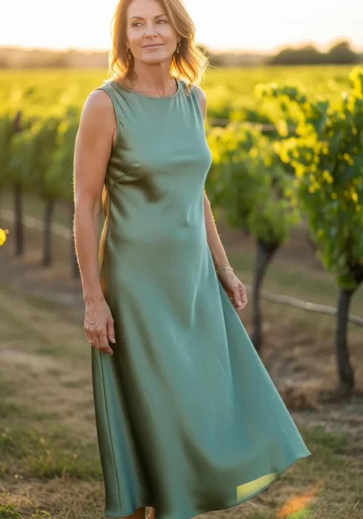 I always have a soft spot for satin dresses like this because they instantly elevate any look. No matter your style, this kind of silhouette feels timeless and refined while still being relaxed enough for an outdoor setting.