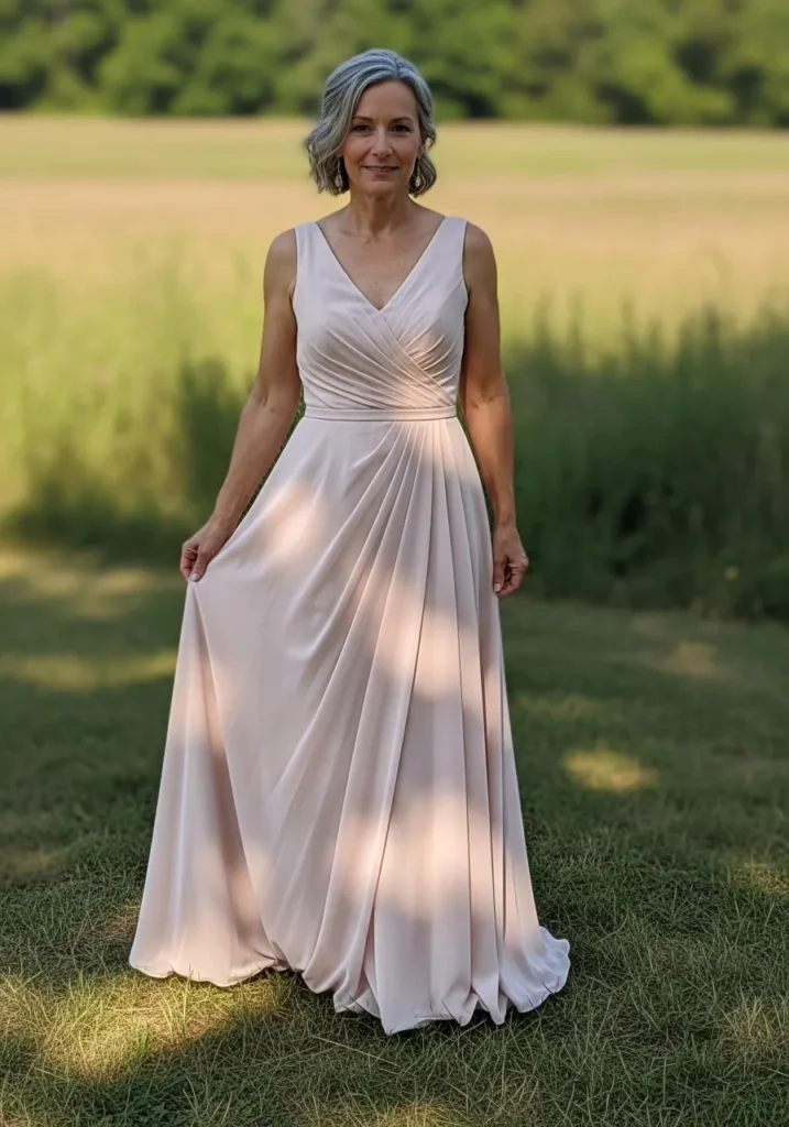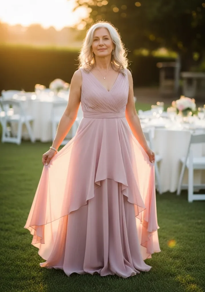 This blush chiffon dress features a flattering V neckline, softly pleated bodice, and a full A line skirt that flows naturally with each step. The delicate fabric catches the light beautifully, giving the entire look a soft glow that feels perfect for an outdoor celebration.