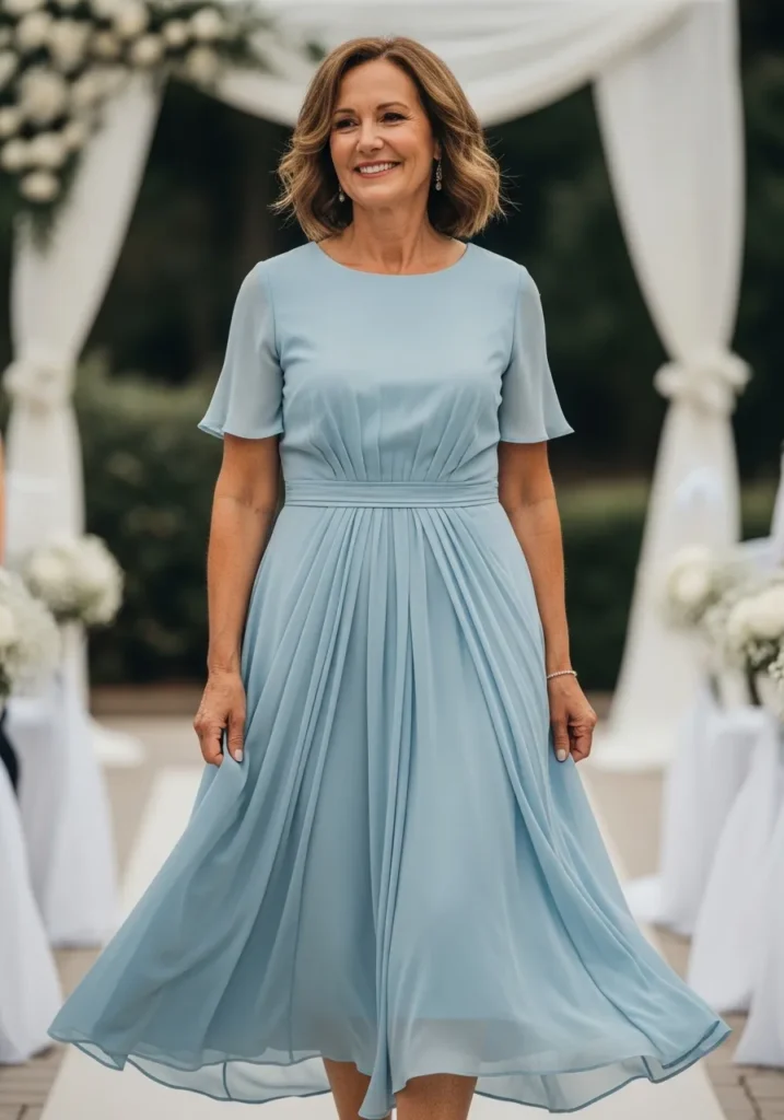 This dusty blue chiffon midi dress features short sleeves, a softly gathered waist, and a gently flared skirt that moves gracefully with each step. The classic cut paired with the airy fabric creates a polished yet relaxed look.