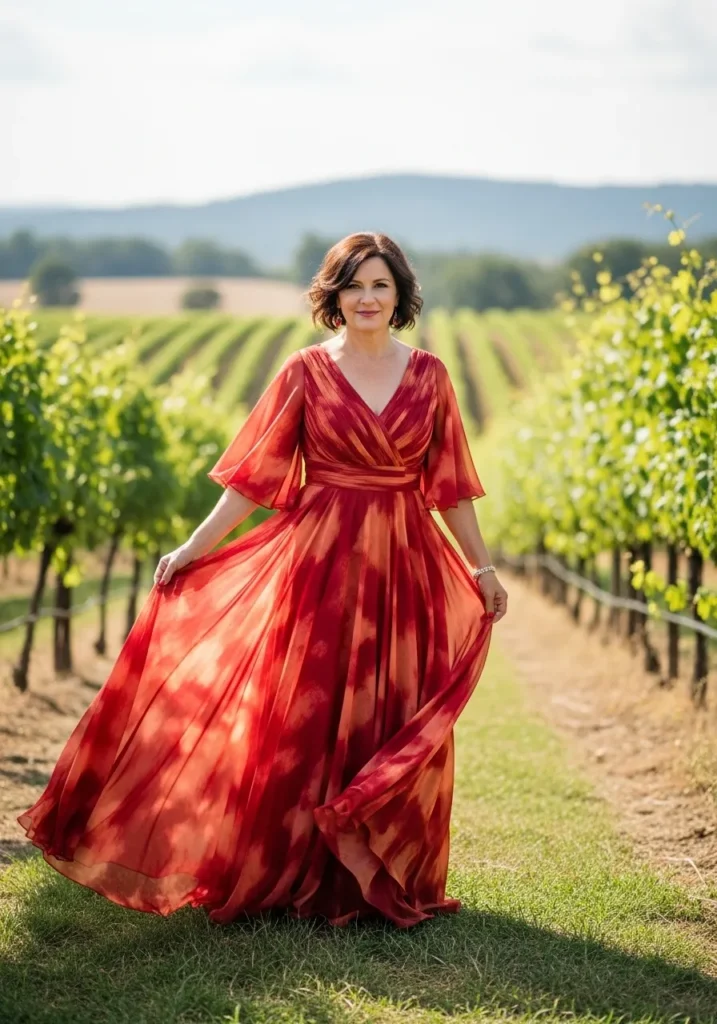 This rich red chiffon gown features a softly draped bodice, flowing sleeves, and a full skirt that moves beautifully through the vineyard setting. The lightweight fabric catches the breeze, creating elegant motion that feels bold, romantic, and perfectly suited for outdoor celebrations.