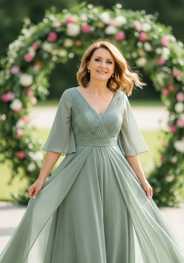 This sage green chiffon gown showcases a gently pleated bodice, flutter sleeves, and a flowing skirt that drapes effortlessly beneath a floral ceremony arch. The soft muted tone pairs beautifully with garden greenery, creating a fresh and romantic outdoor aesthetic.