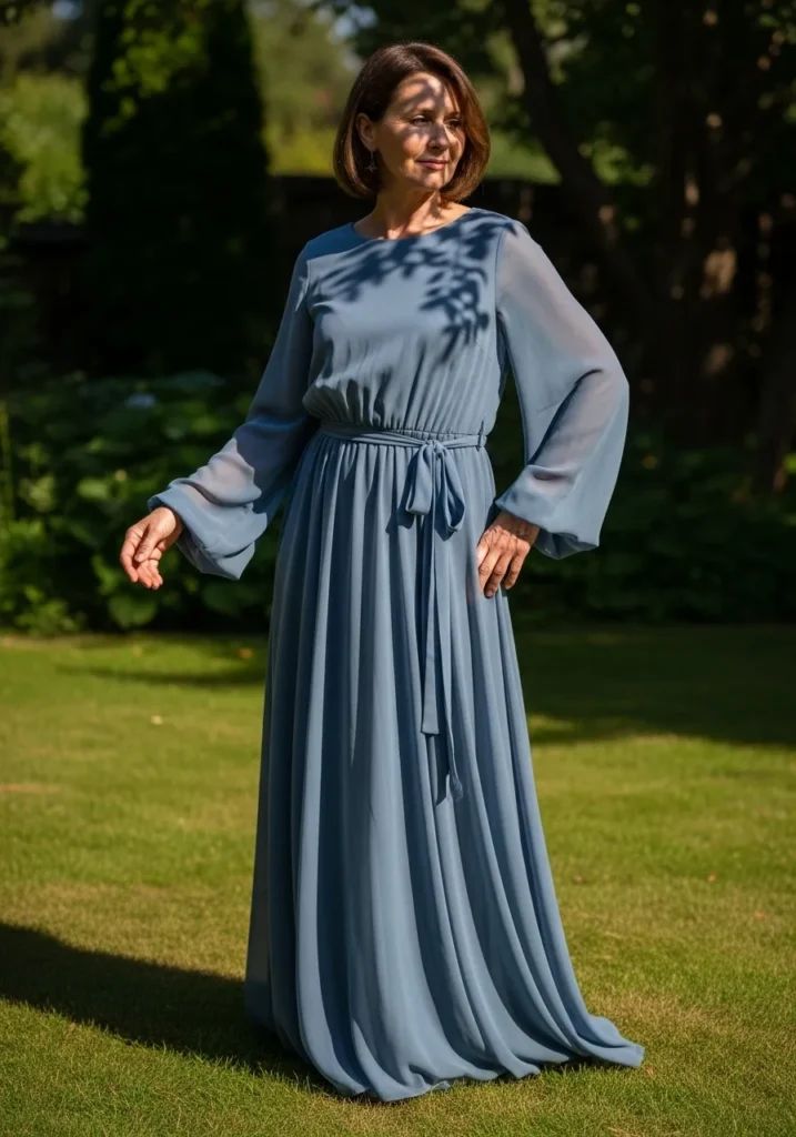 This dusty blue chiffon gown stands out with its softly draped bodice, long flowy sleeves, and full-length skirt that creates gentle movement. The lightweight fabric gives the dress a breezy quality, making it ideal for warm outdoor settings and sunlit garden ceremonies.