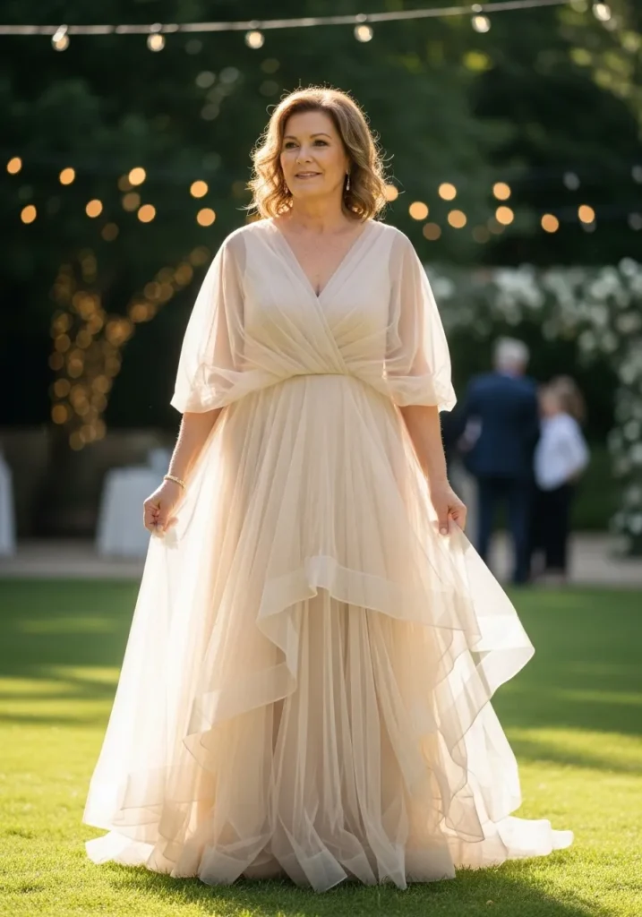 This champagne tulle gown features a delicate V neckline, sheer flutter sleeves, and a layered skirt that creates soft volume and movement. The light neutral tone reflects the warm glow of string lights, enhancing the dreamy outdoor ambiance.
