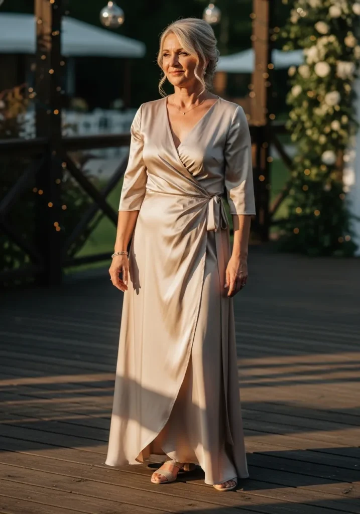 This champagne satin wrap gown showcases a smooth luminous fabric with a gently draped silhouette and a flattering waist tie that highlights the figure. The soft sheen of the satin reflects the warm outdoor lighting, creating a truly elegant and polished appearance.