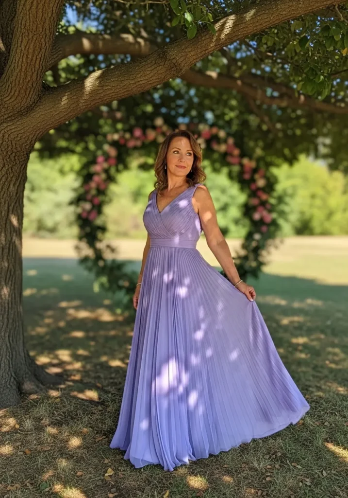 This lavender pleated gown features a softly gathered bodice and a flowing skirt that moves beautifully under the shade of garden trees. The light pastel tone pairs perfectly with floral surroundings, creating a dreamy and graceful overall effect.