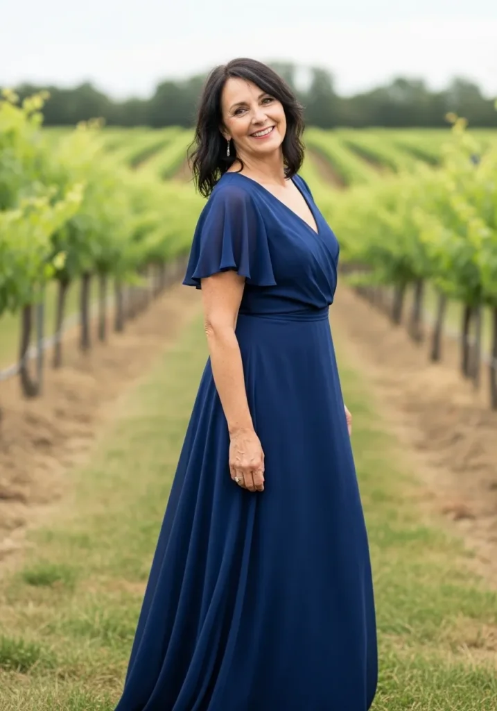 This navy chiffon gown features dramatic cape style sleeves, a fitted bodice, and a flowing skirt that creates striking movement against the vineyard backdrop. The deep blue tone adds richness and sophistication while still feeling perfectly suited for an outdoor celebration.