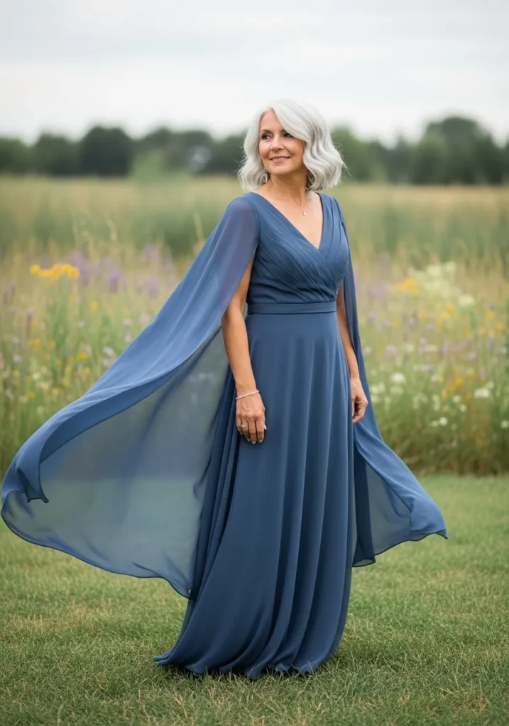 Flowing Navy Gown with Dramatic Chiffon Cape