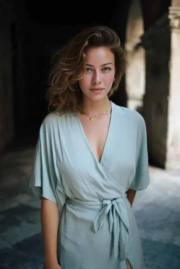This look features a soft blue wrap dress with a relaxed silhouette and a gently tied waist that defines the shape without feeling tight. The V neckline feels elegant and easy while the short flutter sleeves add a light and breezy touch. Her hair is styled in loose natural waves and the makeup looks fresh and glowing which gives the whole outfit an effortless spring feel.