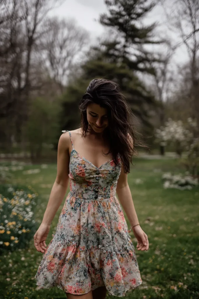 This look features a soft floral sundress with delicate spaghetti straps and a gently fitted bodice that flows into a breezy skirt. The fabric feels light and airy with a watercolor style print in muted spring tones that blend beautifully with the garden setting. Her hair is worn loose and slightly tousled which adds to the effortless feel and the overall styling stays natural and unfussy.