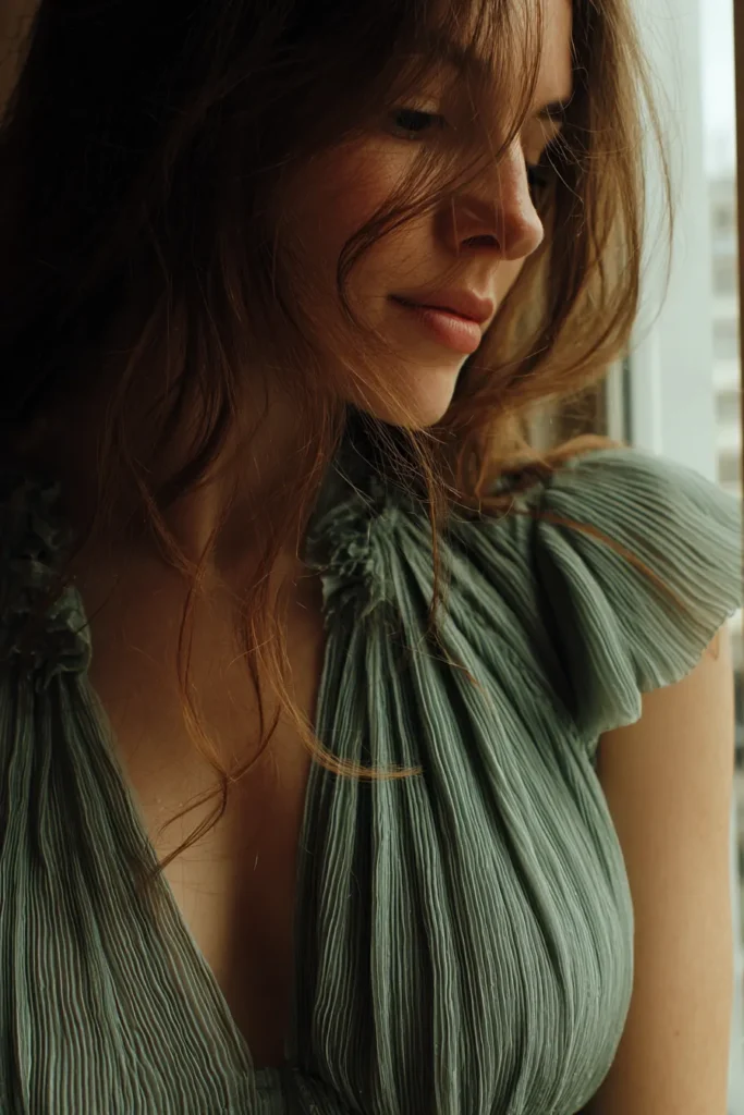 This outfit features a flowing sage green dress with fine pleated texture and softly gathered shoulders that create a graceful drape. The neckline is gently open which adds an elegant touch without feeling too bold and the fabric catches the light in a very flattering way. Her hair is worn loose with natural movement and the makeup looks fresh and minimal which keeps the focus on the dress.