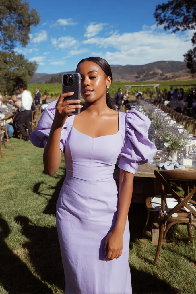 This look shows a soft lilac dress with structured puff sleeves and a fitted bodice that creates a really flattering silhouette. The neckline feels modern and feminine and the fabric looks smooth with just enough structure to hold its shape. Her hair is styled sleek and pulled back which lets the dress shine and the makeup is glowy and polished for a fresh outdoor wedding setting.