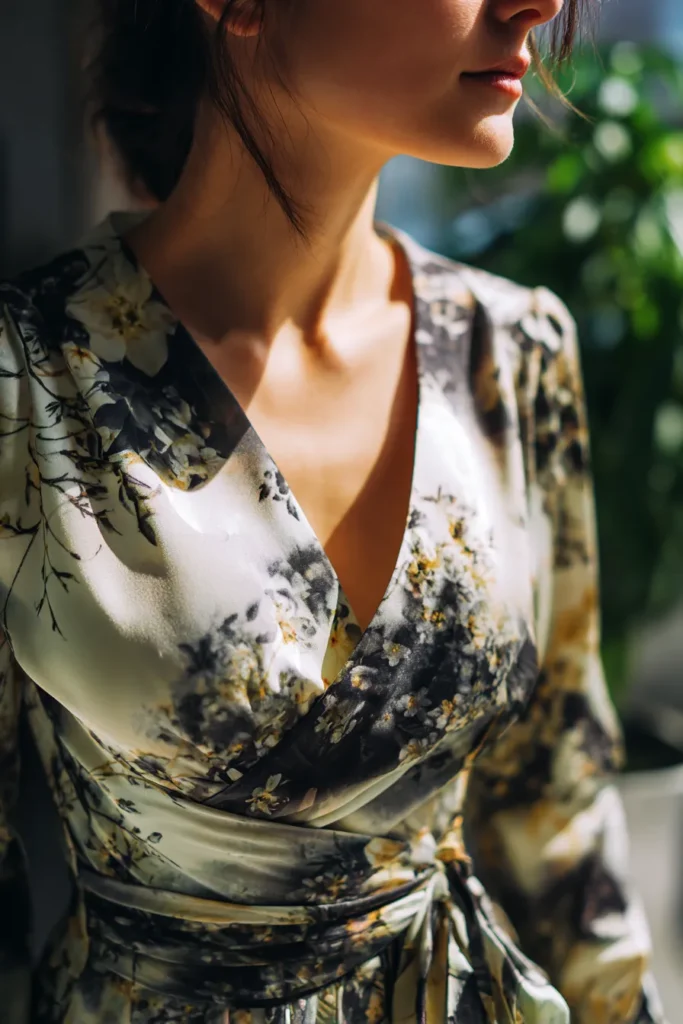 This outfit features a wrap style dress with a delicate botanical print in muted cream and olive tones. The V neckline feels feminine and balanced and the fabric has a gentle sheen that catches the light beautifully. Her hair is styled back in a relaxed low bun with a few soft pieces framing the face and the makeup looks fresh and natural.