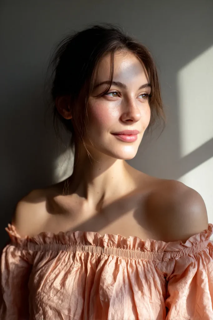 This look features a soft blush off the shoulder top with gentle gathers along the neckline that create a romantic shape. The fabric looks lightweight and slightly textured which adds interest without feeling fussy. Her hair is pulled back loosely with face framing pieces and the makeup is fresh and glowing with rosy cheeks and a natural lip.