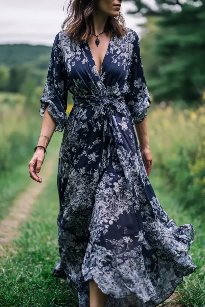 This look features a flowing navy wrap maxi dress with a soft floral print in muted light tones. The V neckline feels elegant and balanced while the tie waist defines the silhouette beautifully. The sleeves are relaxed and slightly billowy which adds movement and the fabric drapes effortlessly as she walks. Her hair is worn down with natural waves and the styling stays simple which lets the dress stand out.
