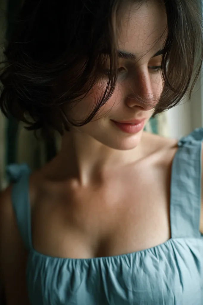 This look features a soft powder blue dress with a clean square neckline and wide straps that feel modern and elegant. The fabric looks light and slightly textured which gives the dress a relaxed spring feel. Her hair is styled in a loose short cut with soft pieces falling naturally around the face and the makeup stays fresh with rosy cheeks and a natural lip.