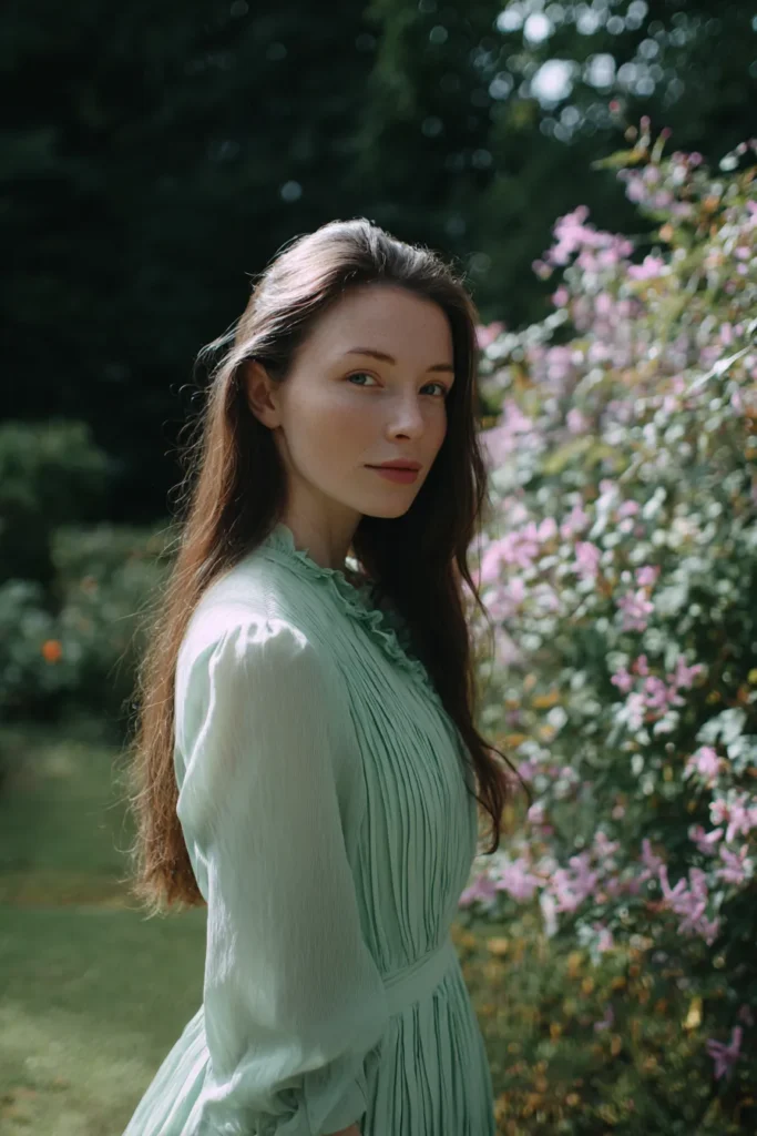 This look features a soft mint green dress with delicate pleating through the bodice and long airy sleeves that feel light and romantic. The neckline is gently detailed which adds interest without overpowering the design. Her hair is worn long and natural with minimal styling and the makeup stays fresh and barely there which fits perfectly with the garden setting and blooming florals around her.