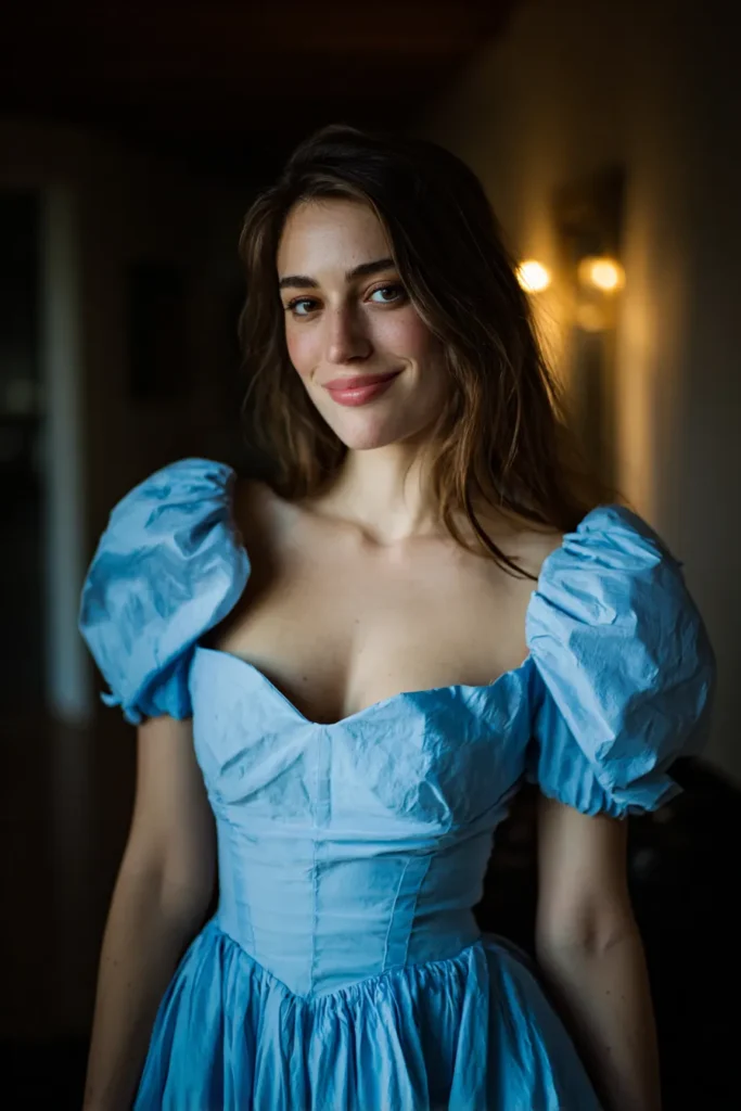 This look features a soft sky blue dress with a fitted bodice and dramatic puff sleeves that instantly catch the eye. The neckline feels romantic and slightly structured while the skirt flows gently for a balanced silhouette. Her hair is worn down with loose natural waves and the makeup stays fresh and glowing which keeps the overall vibe light and approachable.
