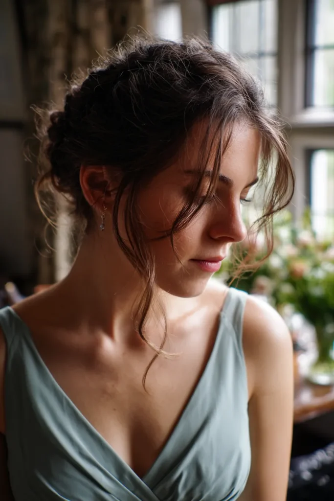 This look features a soft sage green dress with a gently draped neckline that feels elegant and understated. The fabric falls smoothly across the bodice creating a flattering shape without feeling structured. Her hair is styled in a relaxed updo with loose face framing strands and the makeup stays natural and fresh which suits the airy indoor setting beautifully.