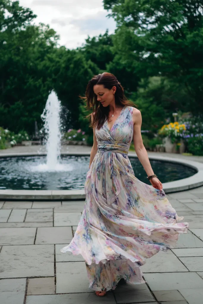 This look features a flowing maxi dress with a soft watercolor floral print in gentle pastel shades. The V neckline feels elegant and flattering while the cinched waist adds shape without looking structured. The lightweight fabric moves beautifully as she walks and the skirt catches the breeze in the most romantic way. Her hair is worn loose with natural movement and the styling stays minimal which lets the dress shine against the garden fountain backdrop.