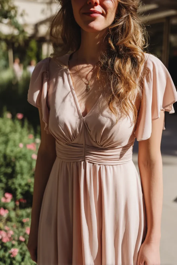 This look features a soft blush dress with flutter sleeves and a gently gathered waist that creates a flattering and feminine shape. The V neckline adds elegance without feeling too revealing and the lightweight fabric drapes beautifully in natural light. Her hair is worn in loose waves with a relaxed finish and the makeup stays fresh and natural which works perfectly for an outdoor spring setting.