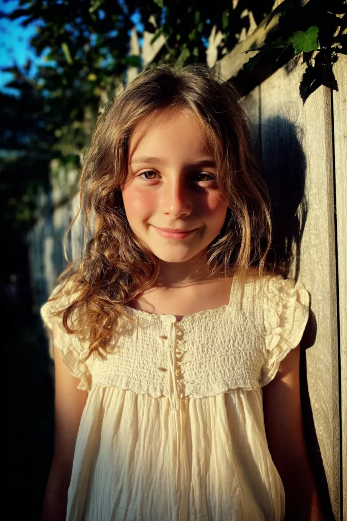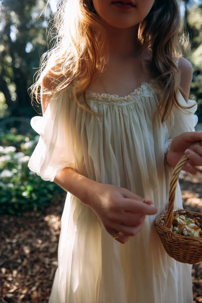This flower girl is wearing a soft cream dress with a gently smocked bodice and fluttery short sleeves that feel light and comfortable. The fabric has a natural texture that adds quiet detail without needing anything extra. Her hair is worn loose with soft waves framing her face, and the warm sunlight brings out a rosy glow that makes the whole look feel sweet and natural.