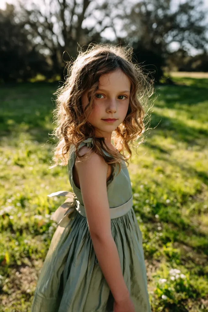 This look features a young flower girl wearing a soft sage green dress with a gentle, flowing silhouette that feels perfectly suited for a spring celebration. The sleeveless design and gathered skirt give it an airy, effortless feel, while the subtle bow tied at the back adds a sweet detail without overpowering the simplicity of the dress. Her loose curls frame her face naturally, catching the light and giving the whole look a fresh, outdoorsy glow that feels right at home in a garden setting.
