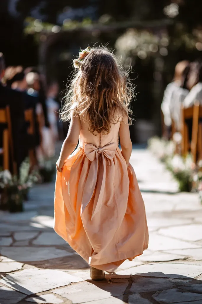 This flower girl look features a soft peach chiffon dress with a full, airy skirt that moves beautifully as she walks down the aisle. The back of the dress steals the show with an oversized bow that ties neatly at the waist and trails gently down the skirt. Her long wavy hair is left loose and natural, finished with a small floral hair piece that feels sweet and perfectly suited for a spring ceremony. The warm peach tone glows in the sunlight and pairs effortlessly with an outdoor aisle lined with greenery.