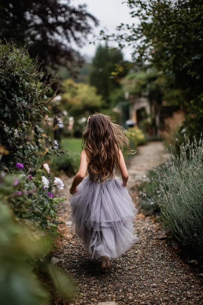 This flower girl is wearing a soft lavender tulle dress with layered ruffles that create a light, dreamy shape as she walks along a garden path. The bodice features delicate detailing that adds texture without feeling heavy, while the skirt flows freely with each step. Her long hair is worn loose down her back, slightly tousled and natural, which pairs beautifully with the romantic setting filled with greenery and blooming flowers.