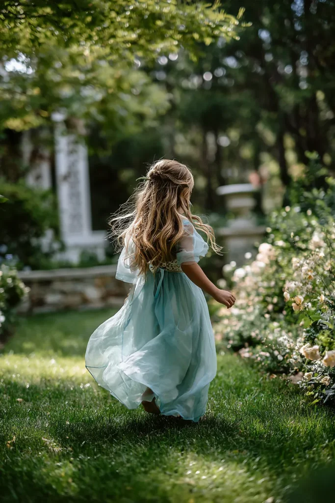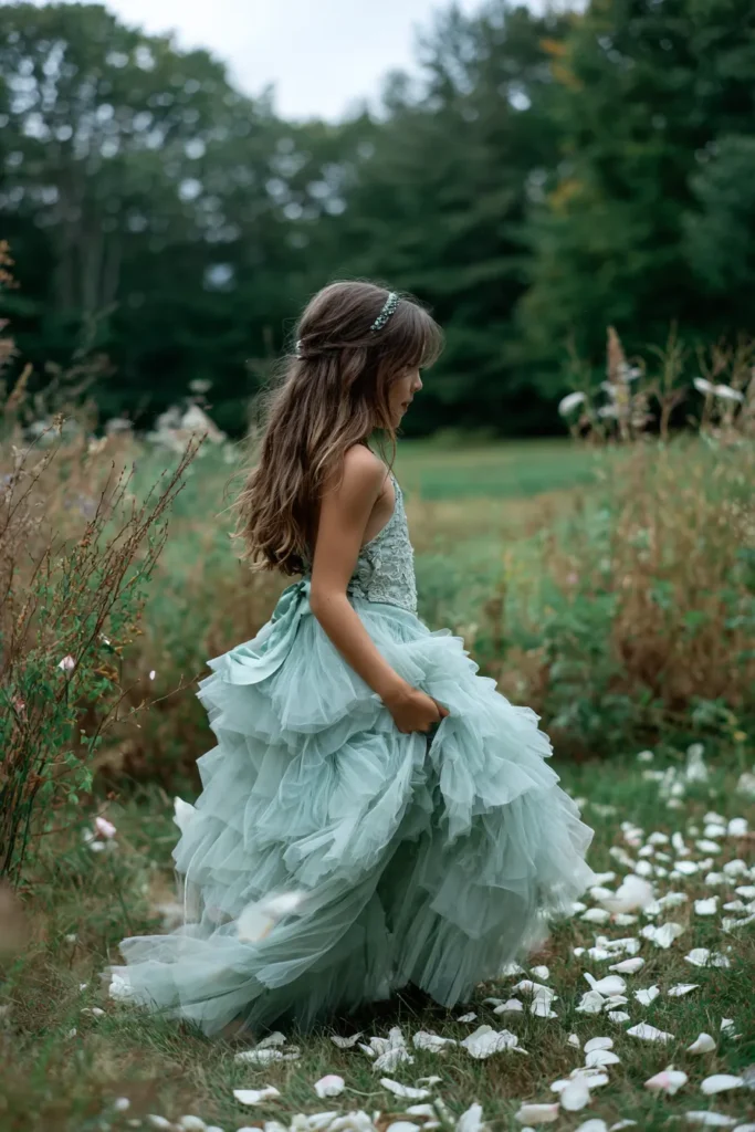 I love how this look feels full of movement and quiet magic. The seafoam shade is fresh and spring ready, and it looks stunning against natural greens and florals. To me this style is perfect for outdoor ceremonies where kids can wander and twirl a little. It feels graceful without being stiff, and it captures that carefree charm that makes flower girl moments so memorable.