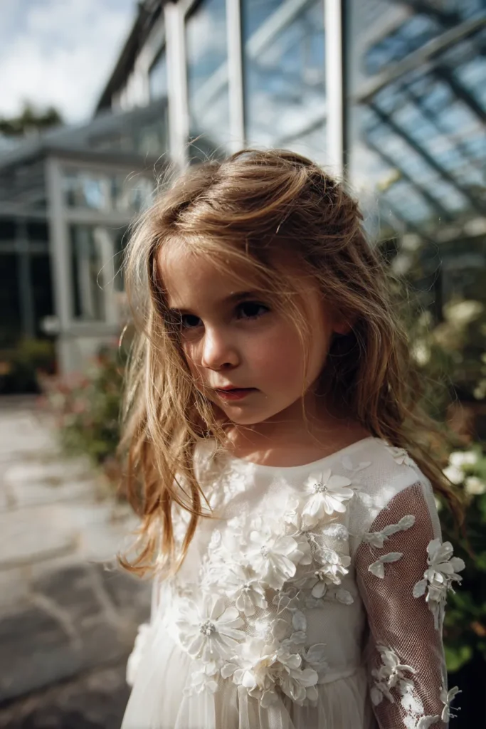 This flower girl is wearing an ivory dress adorned with soft floral appliqué details that bloom across the bodice and sheer sleeves. The three dimensional flowers add texture and a gentle romantic feel without overwhelming the look. Her hair is worn loose with a natural side part, slightly tousled in a way that feels effortless and sweet. The light filled greenhouse setting behind her makes the ivory tones glow and highlights every delicate detail.